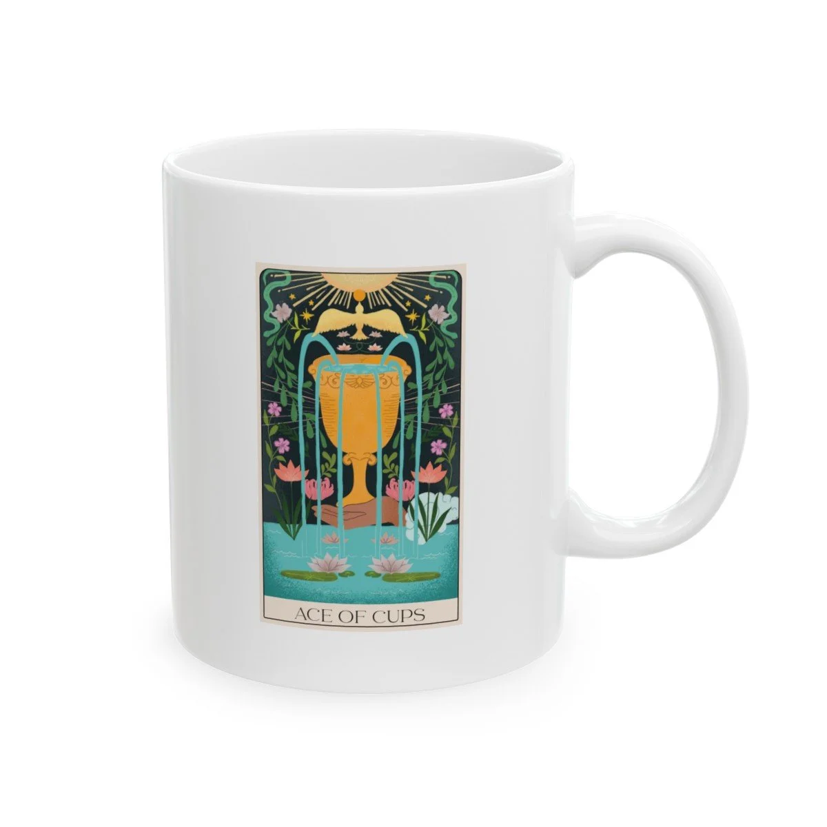 Captivating Design: The mug features a vibrant and detailed illustration inspired by the Ace of Cups, complete with flowing waters, blooming flowers, and mystical energies, making every sip a magical experience.