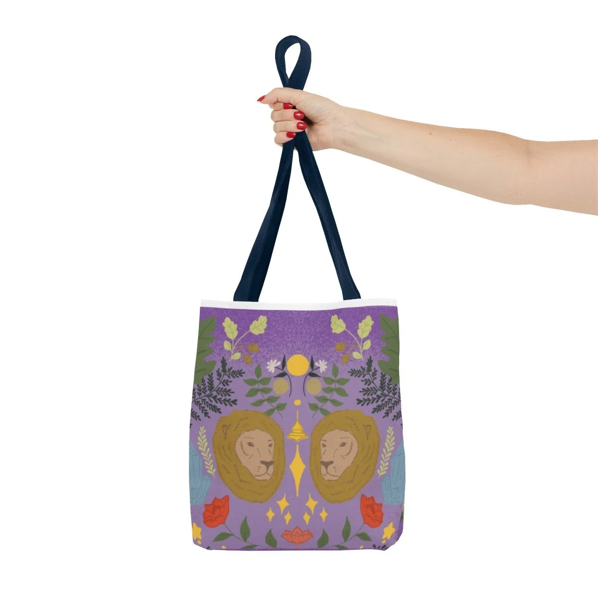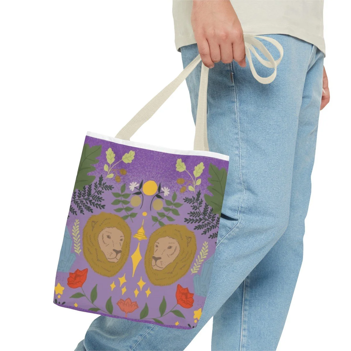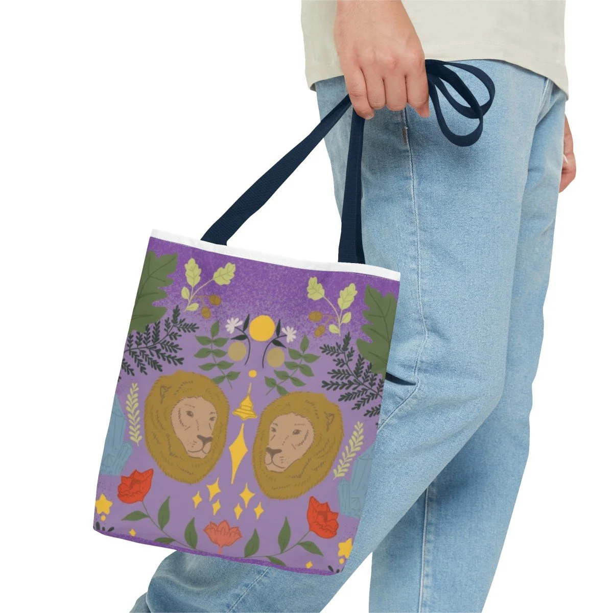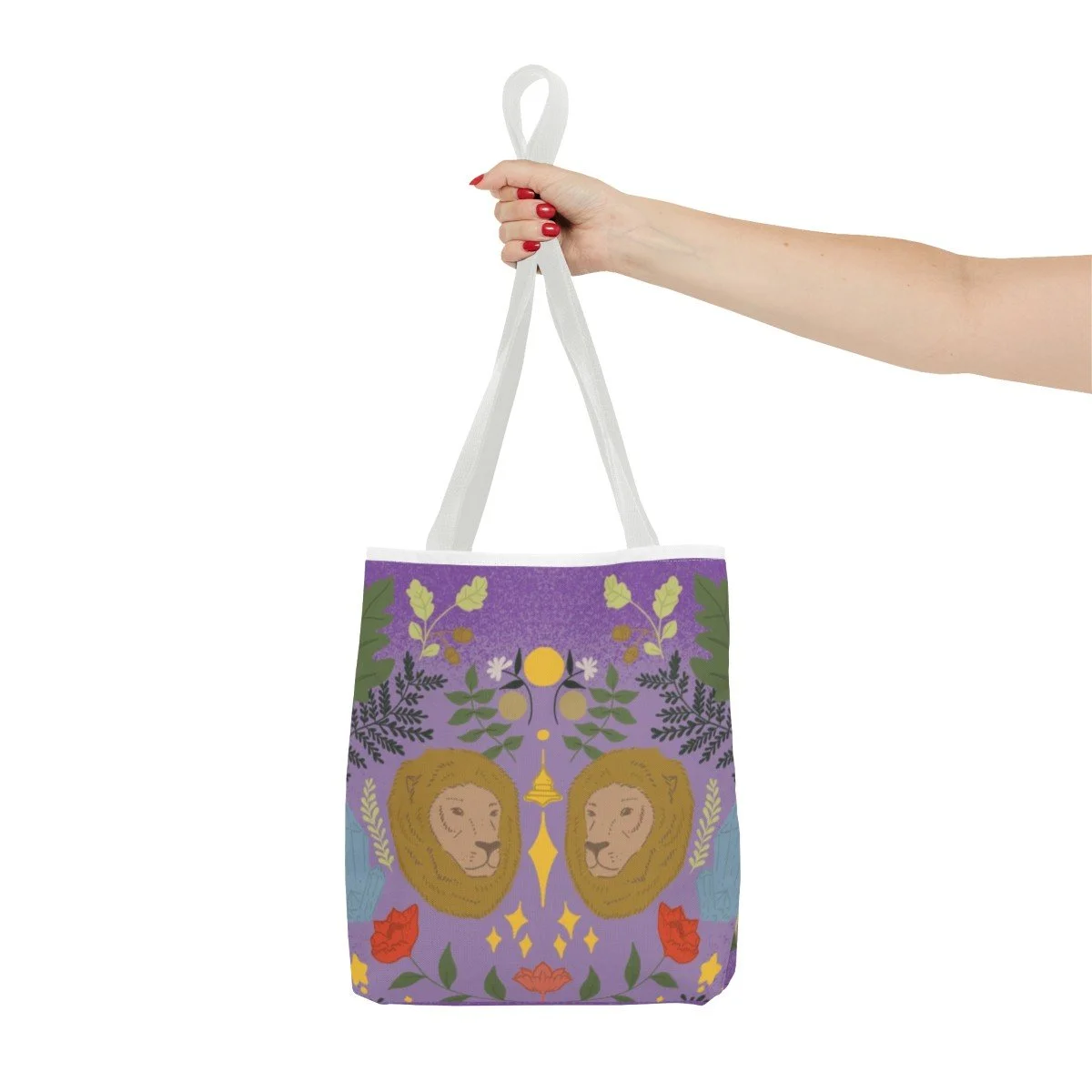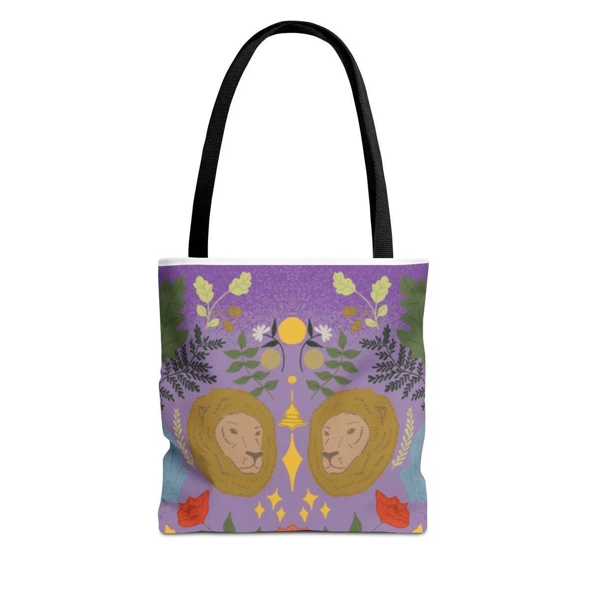 Unique Tarot Design: Inspired by the Strength card, our tote features twin lions symbolizing courage and stability, set against a serene purple backdrop adorned with symbolic flora and celestial motifs.