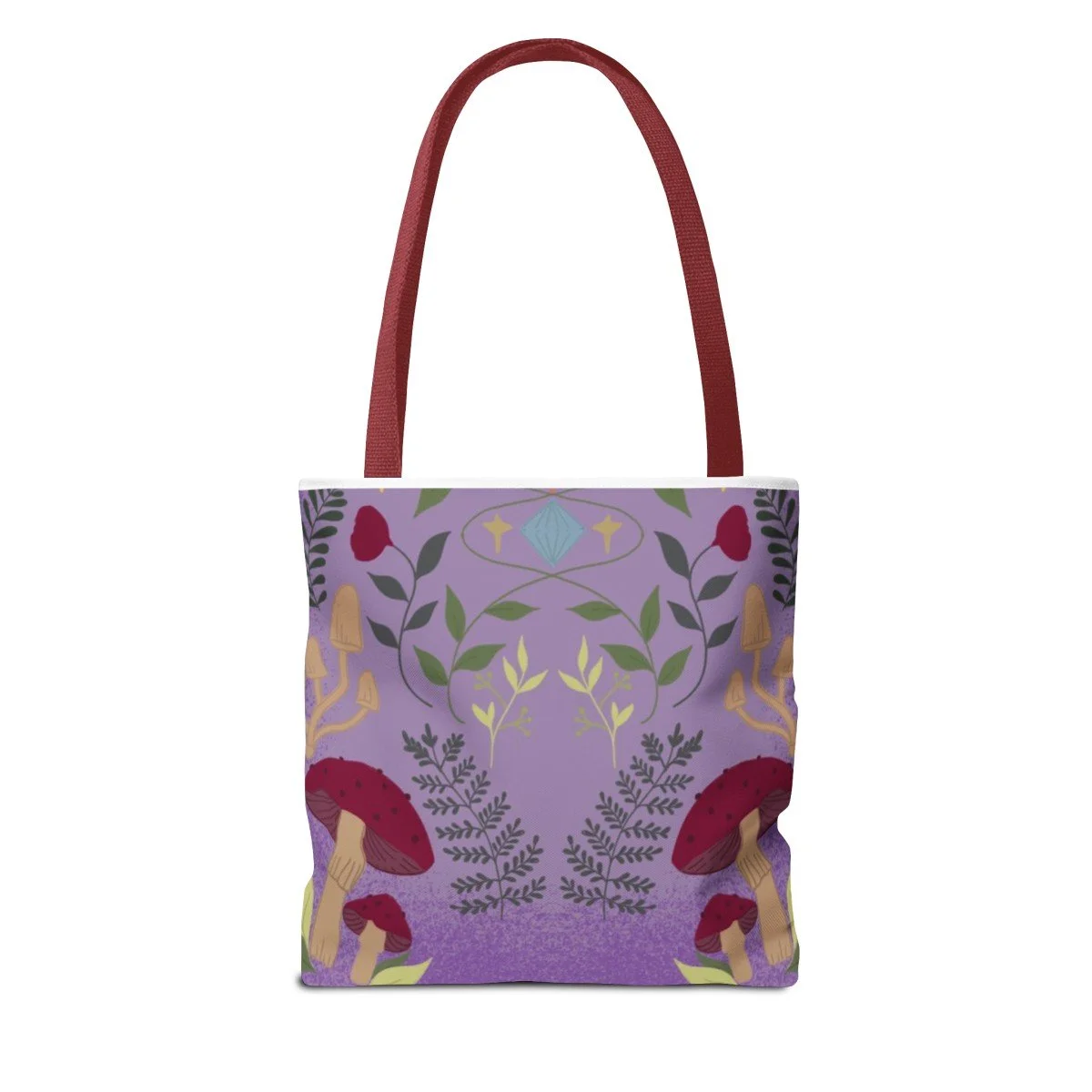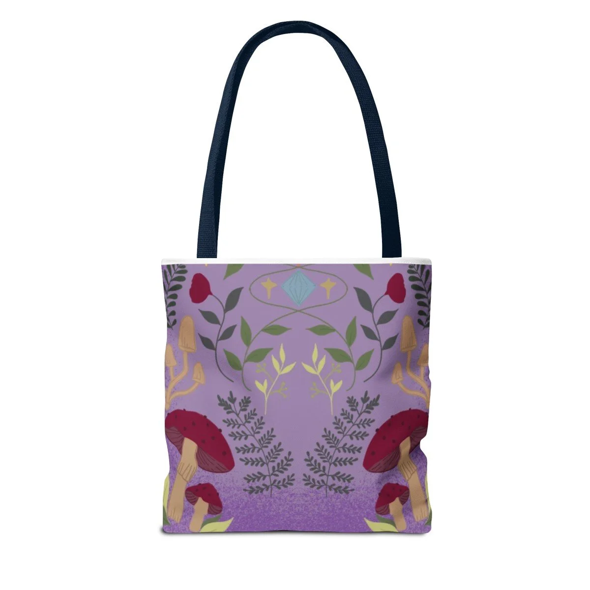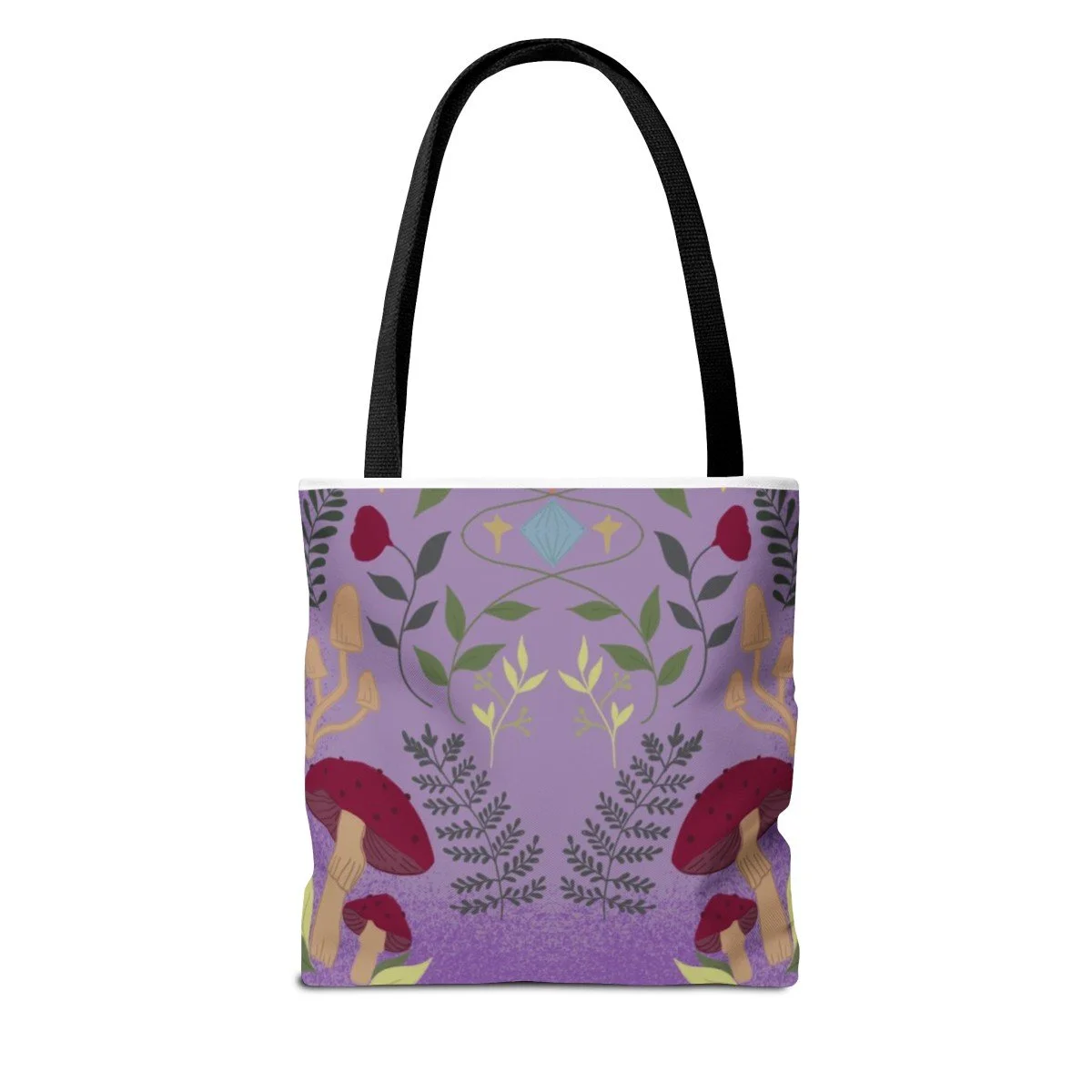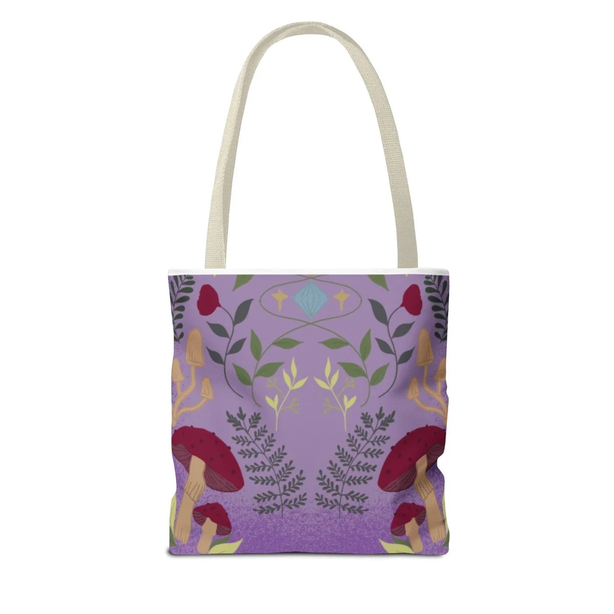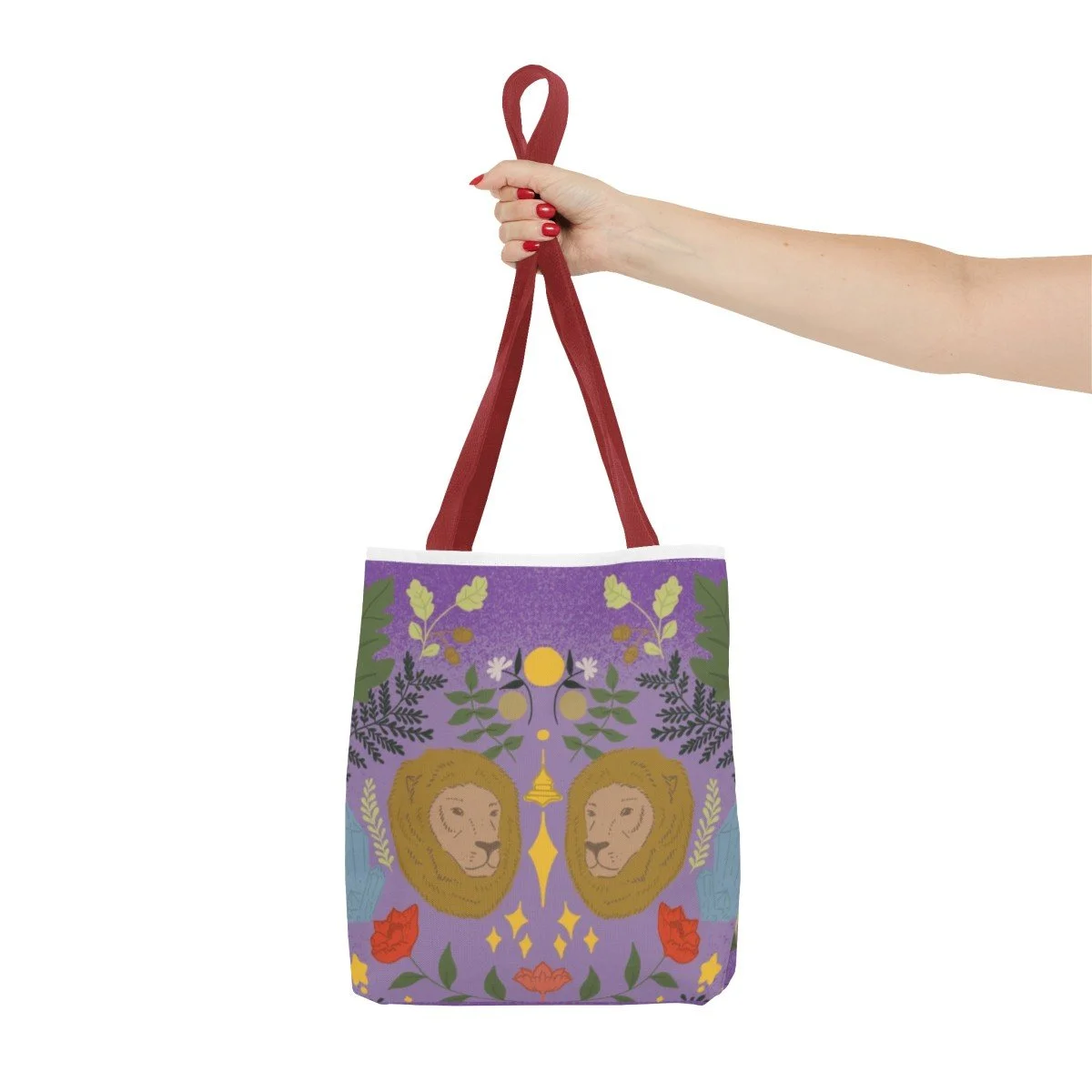 Unique Tarot Design: Inspired by the Strength card, our tote features twin lions symbolizing courage and stability, set against a serene purple backdrop adorned with symbolic flora and celestial motifs.